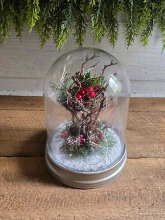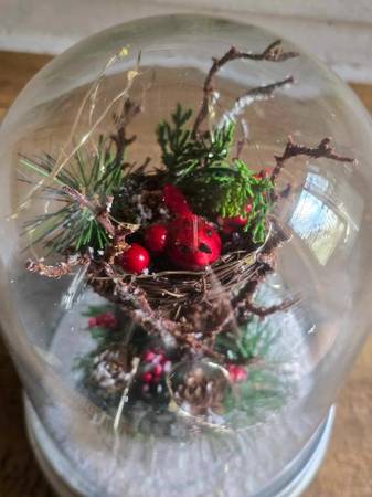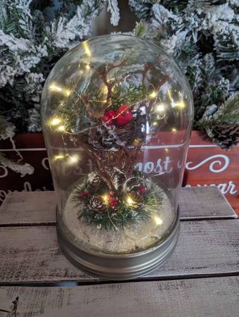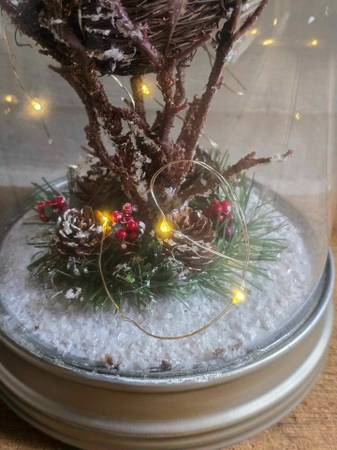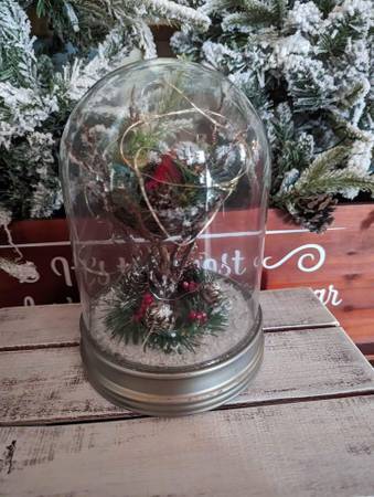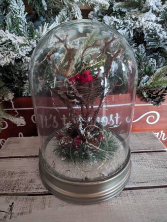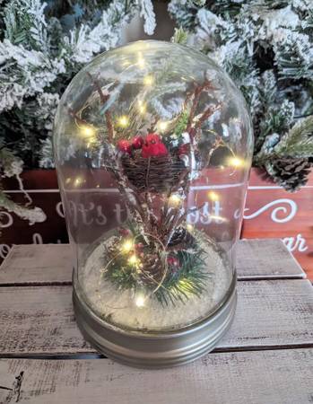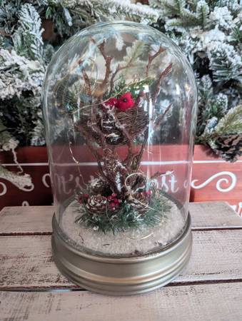Beautiful battery-operated light up cardinal dome with flocked tree and pinecones. It measures 9" high and 6.25" in diameter at the base.