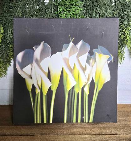12" lily canvas wall hanging. It does have some scuffs and small indents as shown in the close ups.