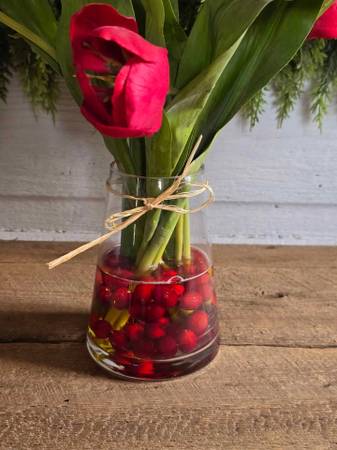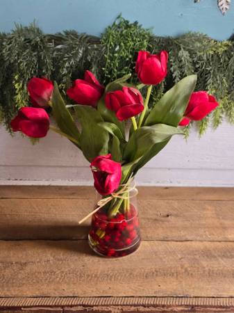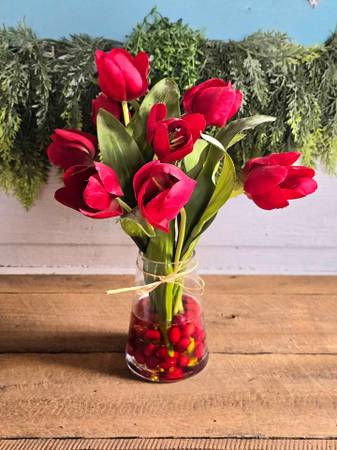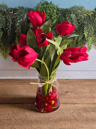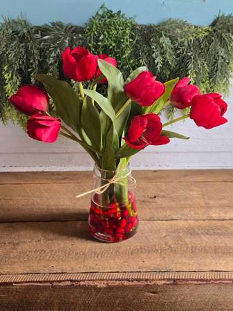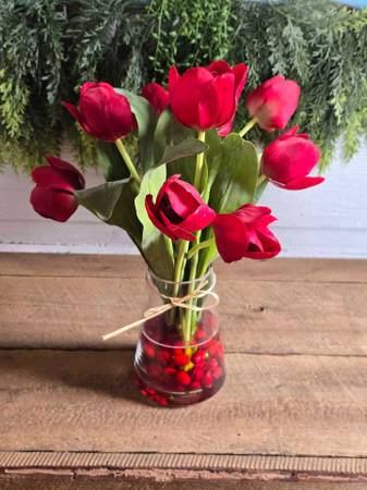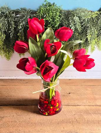 Beautiful faux red tulips attached to a glass vase made to look like it is filled with water (not removable). To the tallest bud it measures 14.75" high, and 14" wide from the furthest flowers...