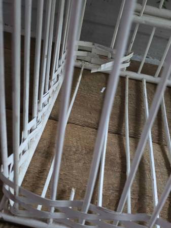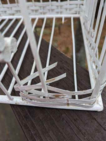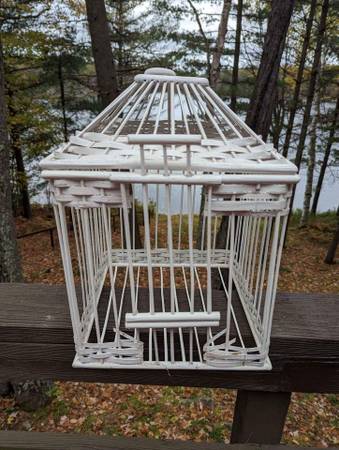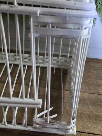 Beautiful shabby chic chippy white paint lightweight wooden and woven bird cage. One rung at the bottom along with the same spot at the front is broken off, and the weaving on the inside by the door just needs some new glue to tack them back down. The ring in the top is currently attached with a zip tie. Perfect for farmhouse decor. It measures 16.25" high, 12" wide, and 12.25" long with the door.
