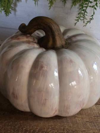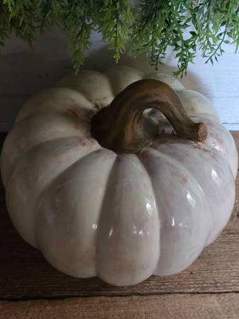 Price is firm. White and brown ceramic pumpkin that measures 6.5" high and 9" in diameter.
