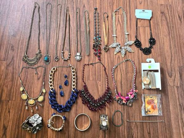 Price is firm. Will not separate. Bundle of various colorful jewelry. It includes 15 necklaces, 5 bracelets, 2 pair of matching earrings, and 2 watches. The Maurices watch is new but does need a battery. The cuff watches battery is exposed at the back and not working. I don't know if it can be fixed or not. One necklace and the pumpkin necklace and earrings are brand new.