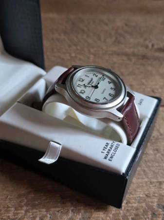 New in box Precision watch. Though it has never been removed, it has been in storage a long time and needs a new battery as a result.