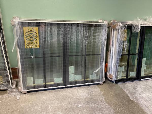 Sierra Pacific Windows H3 Aluminum Clad black and clear coat pine interior, flex screens, Low E-366 sound glass. Sizes/Qty 2-Twin casement 62.5”x 47.5” 2- qtr/half/qtr 96”x47.5” 2- single casement...