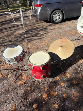 The price includes the vintage floor, Tom, which has some corrosion issues but could be cleaned up by somebody who knows what they’re doing. All the items you see pictured here have been are included with the price. The top high hat symbol says Zim-Gar.