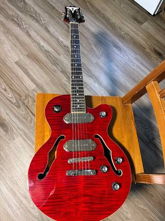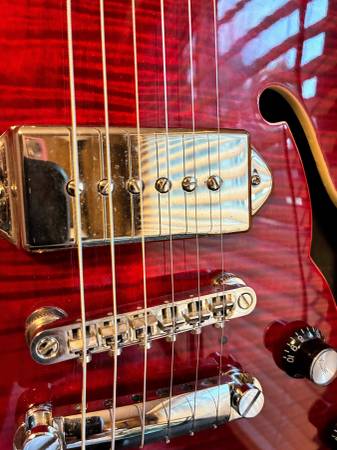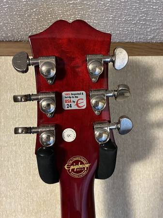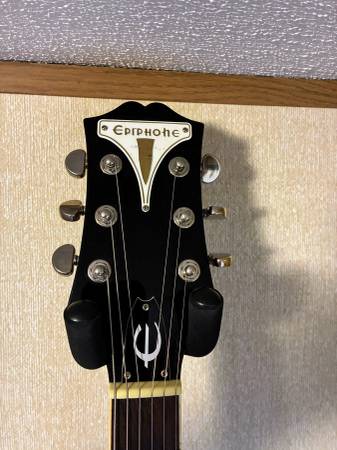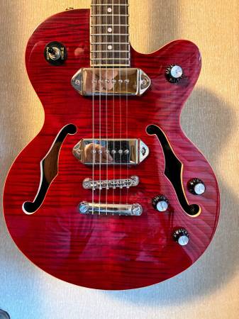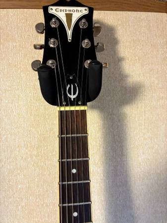 Epiphone Wildcat Guitar in great condition. Plays and sounds great (P90 pick ups are awesome). Originally had a Bigsby tremolo that was professionally replaced with a new bridge (The tremolo holes were filled in so well you can only see them if you are looking for them. See picture).