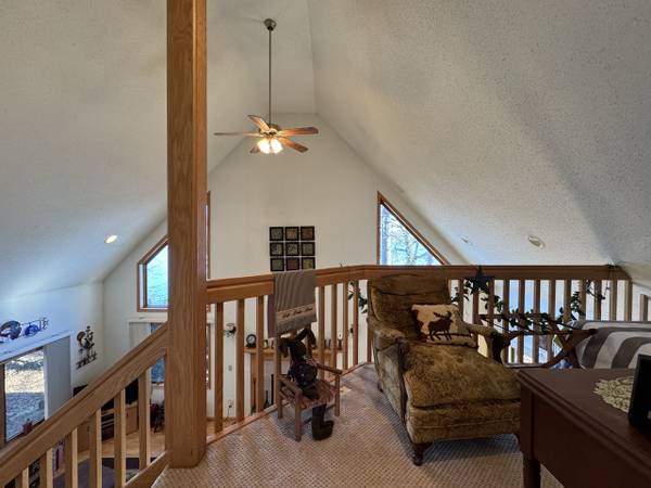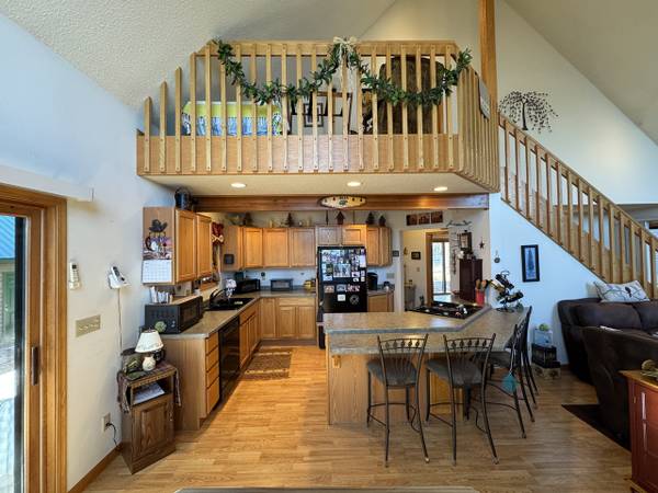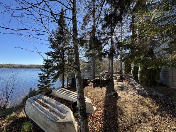 Imagine owning this exceptionally well-maintained home on a peninsula, featuring stunning views of Pine Lake from both sides of the home! Level frontage, great sand for swimming and a firepit area where you feel like you can dip your toes in the lake while roasting marshmallows! Attractive full length covered porch with stamped concrete welcomes you inside to the open concept with soaring cathedral ceiling & gas fireplace. Nice mudroom plumbed for laundry, full BA & BR with WF glass patio door. Upstairs features an open loft, master BR with private WF deck, master BA & lots of closet/storage space. In floor hydronic heat throughout the main level, plus a mini split for air conditioning & quick heat for a chilly night. The garage features drive through overhead doors, finished upper level bunk room with carpet T&G pine walls & ceiling & a lakeside deck. Includes all furnishings, pier, paddleboat, aluminum boat, garage items, LP tank & a 2004 Northwood 22 ft pontoon boat & motor! OFFERED BY CENTURY 21 Pierce Realty, LLC # show contact info