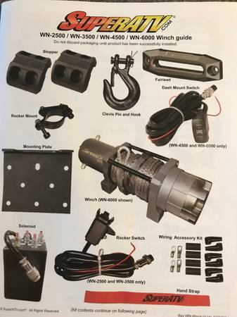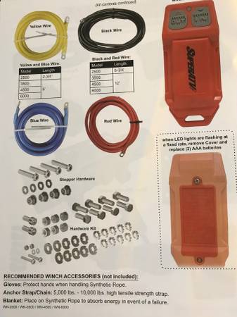 Still in box has everything to install on UTV or ATV. All wiring, solenoid, mounting plate, remote control wireless, dash mounted rocker switch, clevis pin and hook, stopper and fairlead. Synthetic Rope with safety strap.