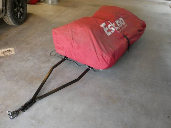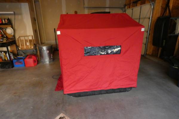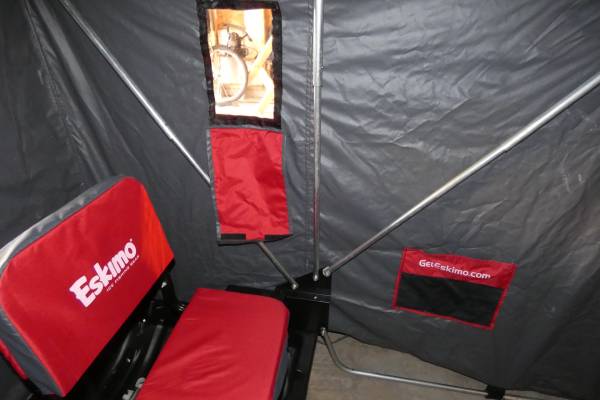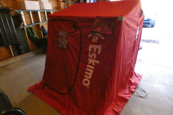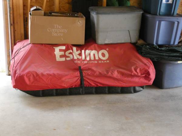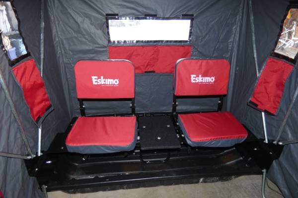 Used only once; stored in garage with cover. 60" two person sled. Multiple windows and air vents. Two fixed ergonomic Versa seats. Accessories include Eskimo polyethylene runners for smooth pulling over the ice; Eskimo tow hitch with mounting brackets; Eskimo travel cover to keep out snow while in transit and critters when stored. Fishable interior area of 22.5 square feet. Can stand up inside or sit on Versa seats.