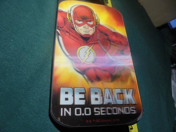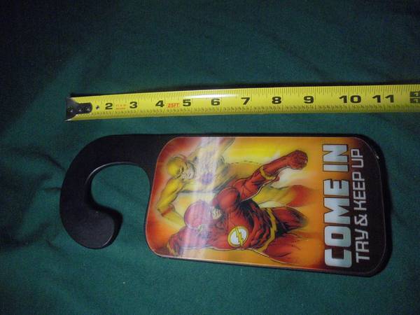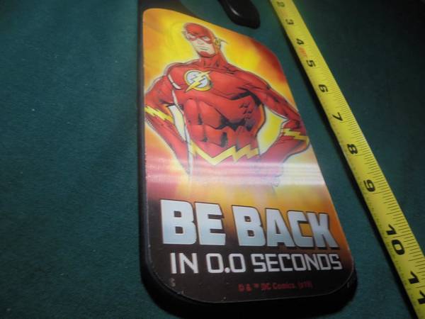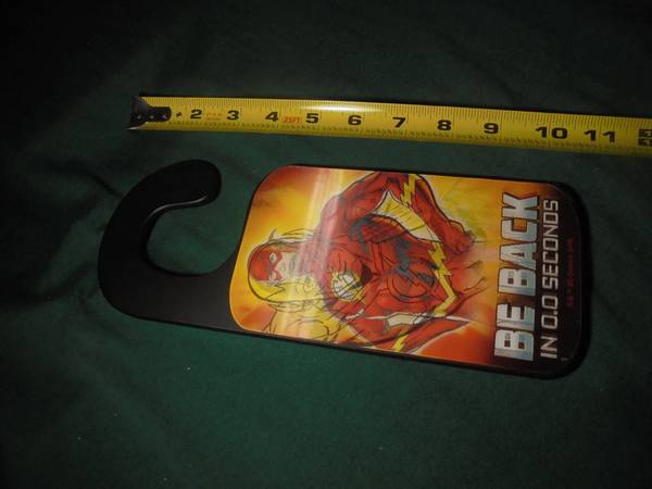 This large 10" tall DC Comics FLASH Door Hang has a HOLOGRAM or LENTICULAR IMAGE on both sides of it! On one side is The Flash and Reverse-Flash with the saying "Come In and Try To Keep Up" and on the other says "Be Back In 0.0 Seconds"!! This is perfect for the busy individual and is a pretty cool collectible! This would be Awesome for the Justice Leaguer in your life!!