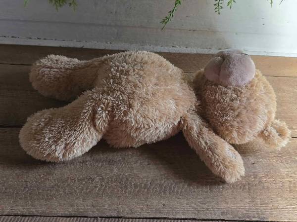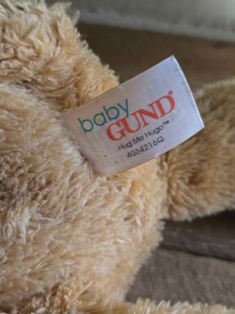 Baby Gund Hug Me Hugo 16" teddy bear that talks. From my understanding the mouth is supposed to move, but I've never seen it do that. The sounds work fine, however.