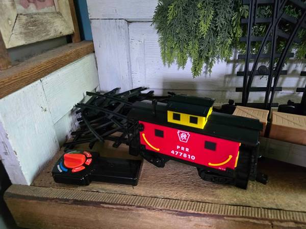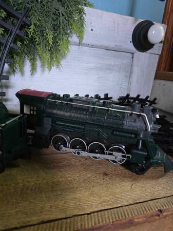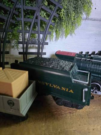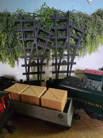 Price is firm. Lionel Pennsylvania gauge train set that was only used a few times. Everything works great. It comes with three extra tracks and a baggie of addition train end pieces to attach in case any should ever break or go missing. Two of the tracks included are working split type. The train requires 6 C cell batteries, and the remote control takes 3 AAA. It can move forward and backward at different speeds, lights up, and makes sounds. The doors on the boxcar can slide open and the crates are removable.