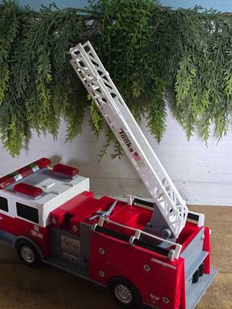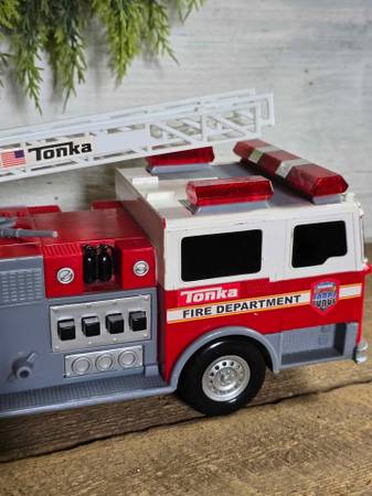 Tonka plastic firetruck that lights up and makes sounds, and the ladder can manually be moved. It has some typical scuffs and surface scratches along with the plastic hose on top broken off the...