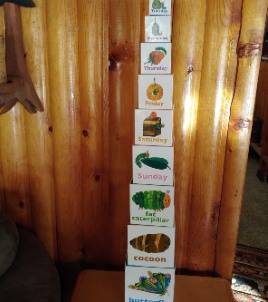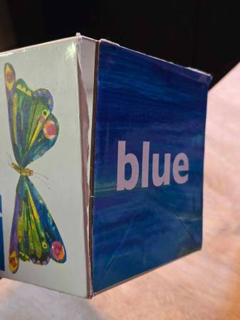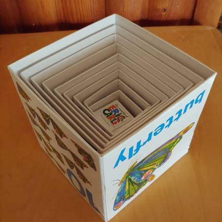 The Very Hungry Caterpillar Eric Carle cardboard stacking boxes toy. It features colors, numbers, shapes, and days of the week. They have some creases and wear. The largest block needs fixing. The...